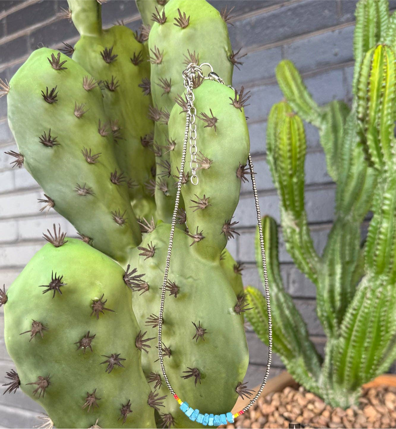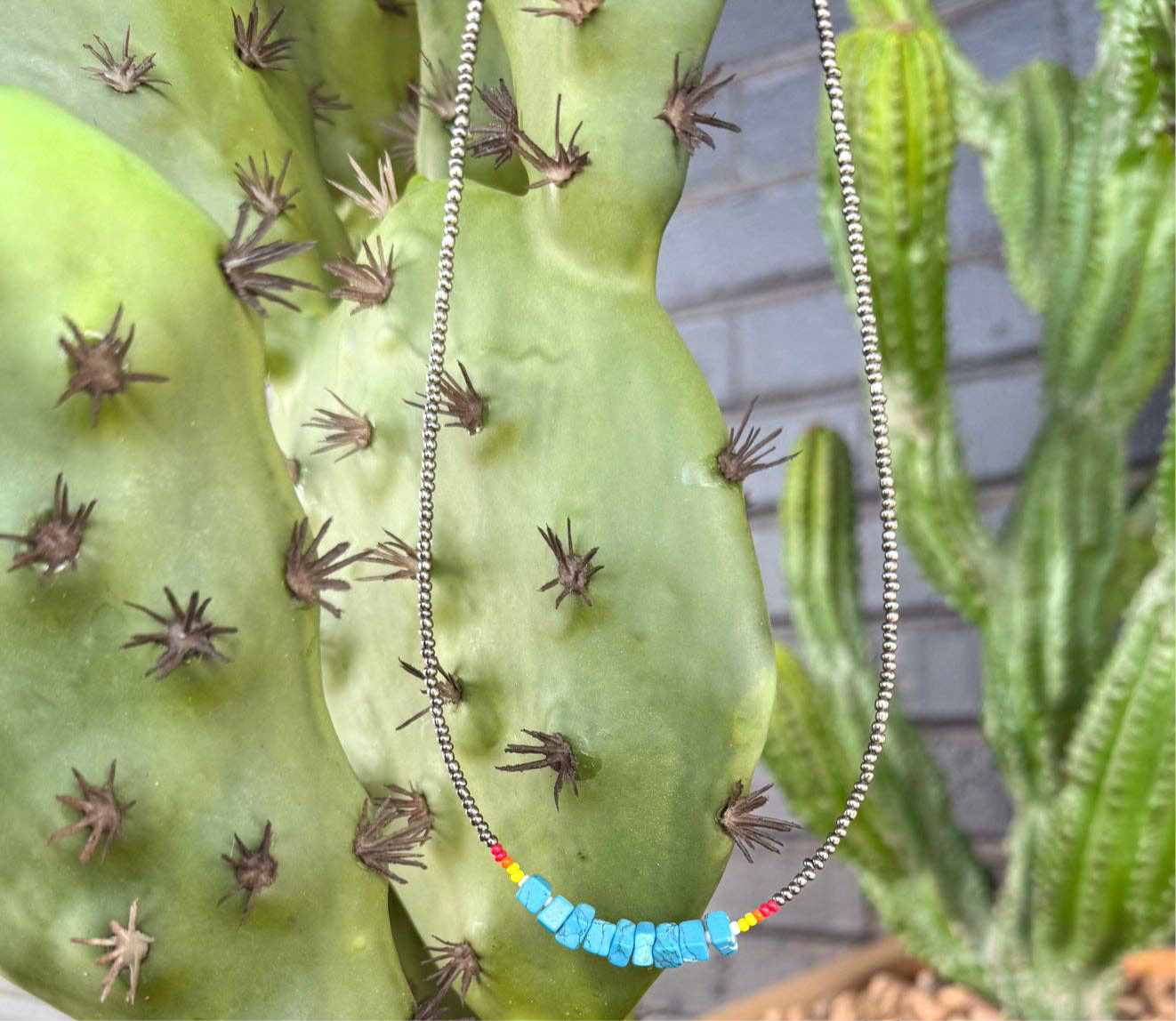 The Vaquera Necklace will add a subtle touch of color to any outfit, a strand of silver beads featuring red, yellow, orange and white beads surrounding turquoise rocks in the center. This necklace is perfect for the cowgirls who prefer smaller jewelry or love to layer with every outfit!